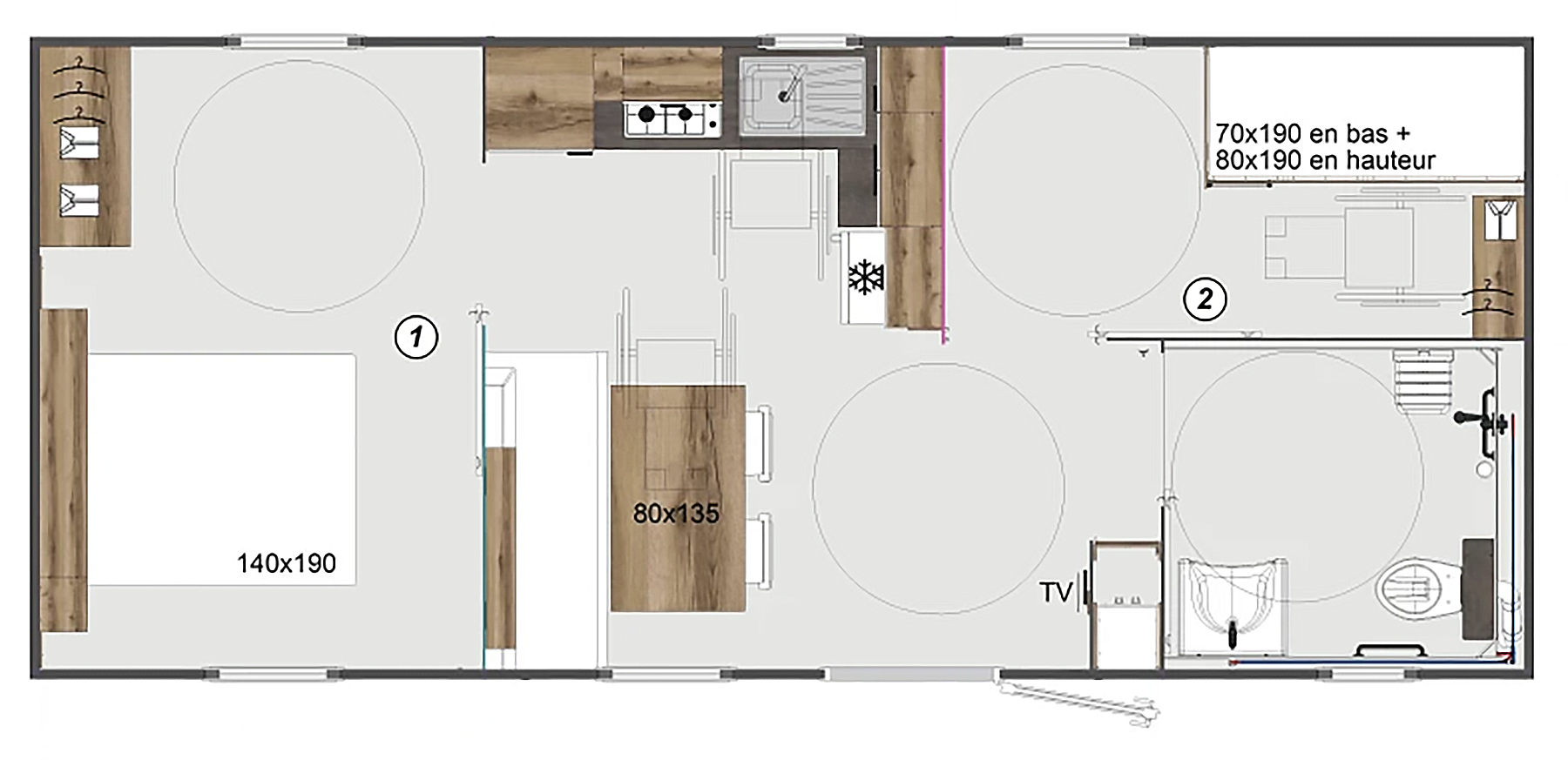Scelga la nostra casa mobile premium con 2 camere da letto per il massimo del lusso. È accogliente e perfetta per chi cerca un soggiorno confortevole e rilassante. Con due camere da letto, ciascuna con il proprio bagno privato, questo spazio offre privacy e comodità. La camera da letto principale ha un letto da 160 cm, ideale per notti di riposo. L'ampio soggiorno si apre su una cucina completamente attrezzata, che rende facile la preparazione di pasti deliziosi. Apprezzerà anche la macchina da caffè Nespresso, perfetta per preparare i suoi caffè preferiti in qualsiasi momento della giornata. All'esterno, l'attende un'ampia terrazza con una zona pranzo conviviale dotata di plancha, che offre il luogo perfetto per rilassarsi al sole. Questa casa mobile di qualità superiore può ospitare fino a 4 persone, il che la rende la cornice ideale per i momenti di relax.